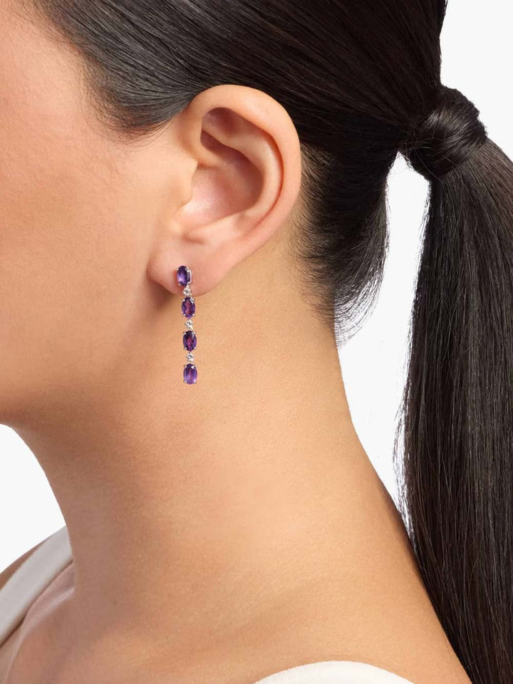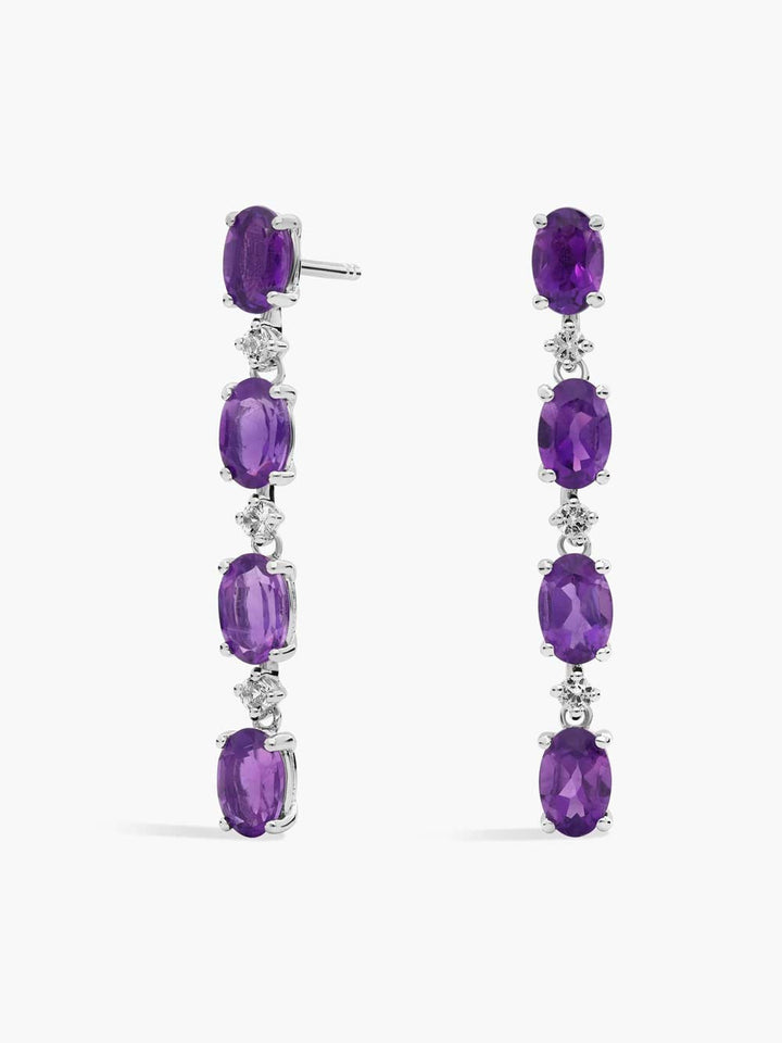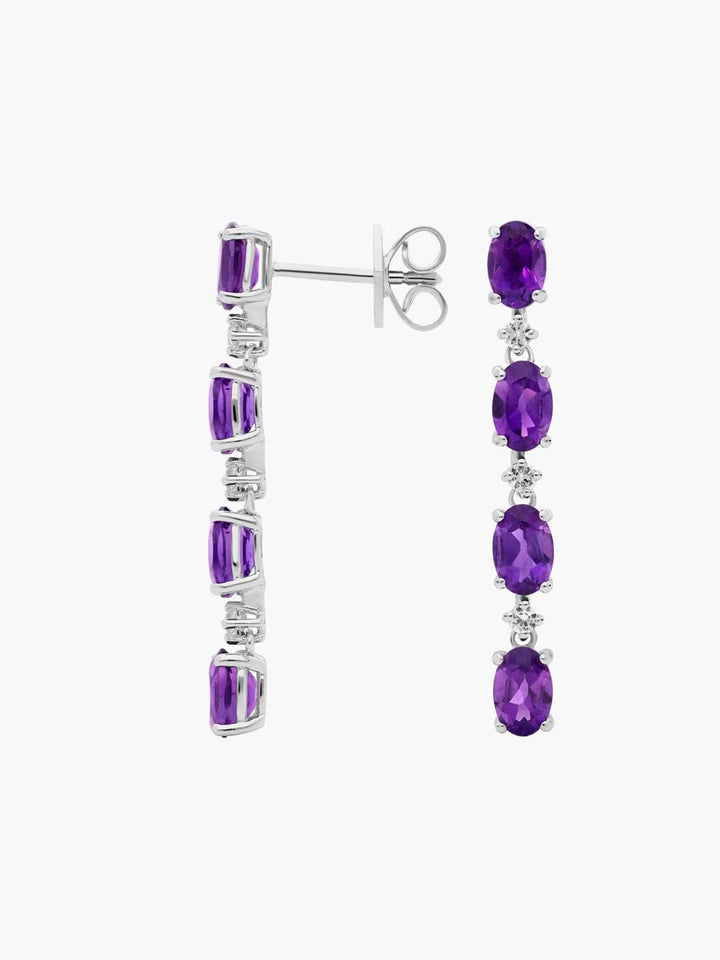 Complementing the amethysts are hand-set natural diamonds, graded G–H in color and VS in clarity, ethically mined from Africa and Russia. Their delicate shimmer frames the vibrant stones, adding refined sparkle and enhancing the earrings’ luxurious appeal.