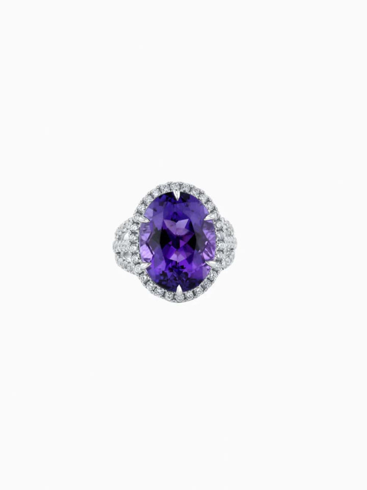 A blend of royal allure and modern sophistication, the Amethyst Diamond Ring captures the eye with its rich color and graceful brilliance. At the center rests a captivating amethyst—renowned for its deep violet hue that symbolizes clarity, calm, and spiritual strength. The gemstone’s cushion or oval cut reveals flashes of lilac and plum with every movement, lending the piece an air of quiet luxury.