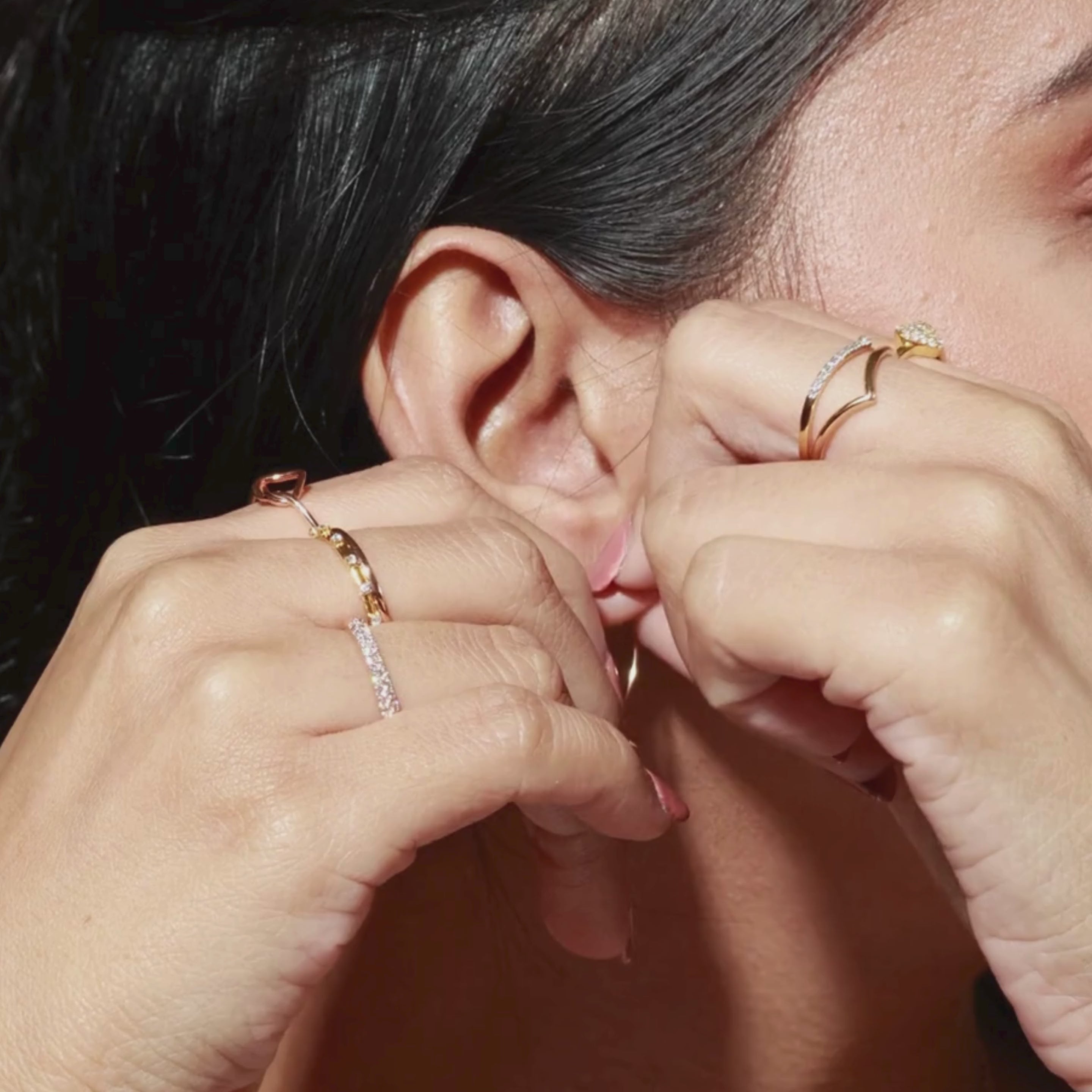 Set within the curves are brilliant-cut diamonds, hand-selected for their G–H color grade and VS clarity, ensuring a radiant sparkle with exceptional purity. These ethically sourced diamonds are strategically placed to catch and reflect light from every angle, adding a refined brilliance to the piece.