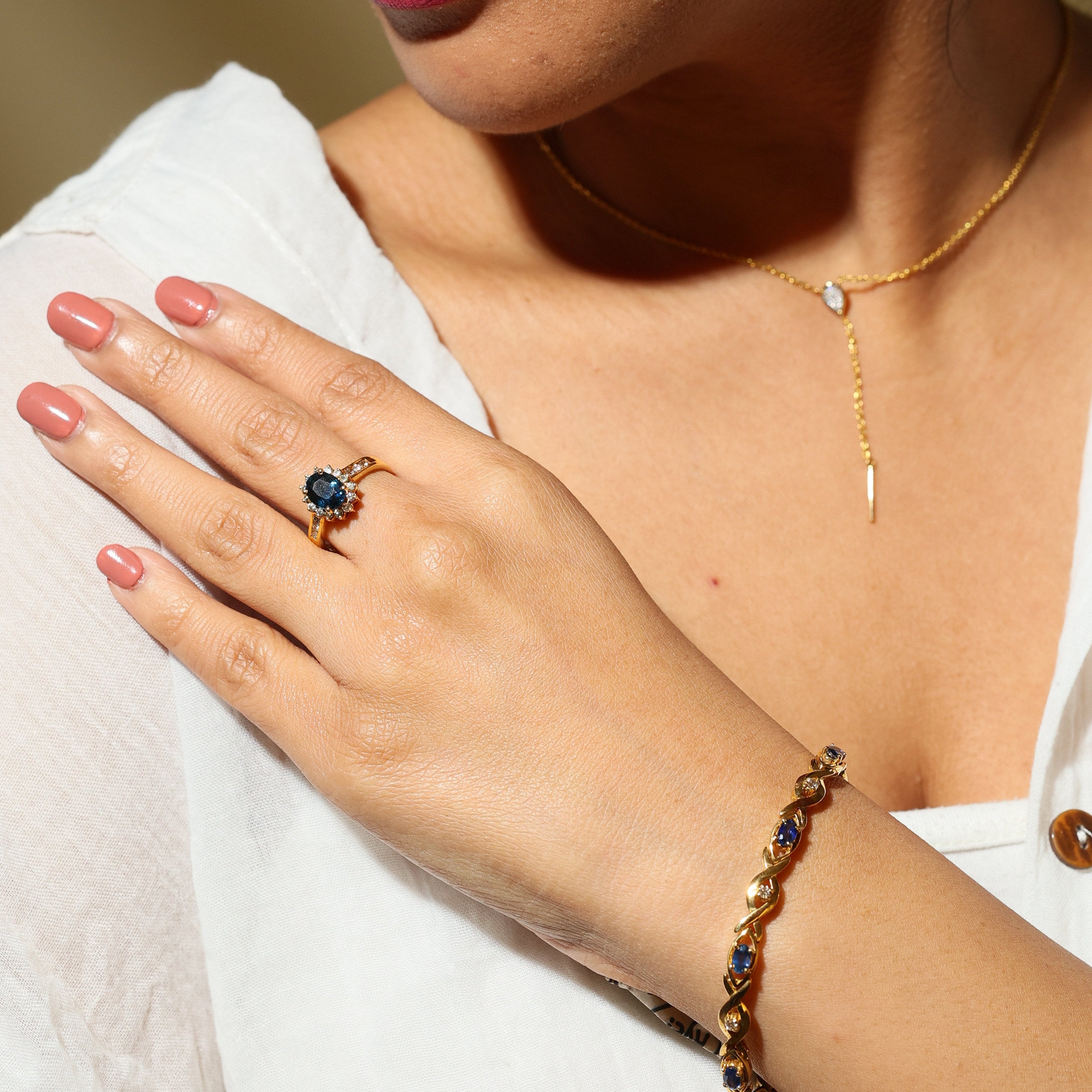 Surrounding the sapphire, a halo of ethically sourced diamonds sparkles with exceptional clarity and brilliance, enhancing the gemstone’s vibrant color and adding a radiant glow. Each diamond is carefully pavé-set to catch the light from every angle, creating an enchanting play of shimmer and fire.