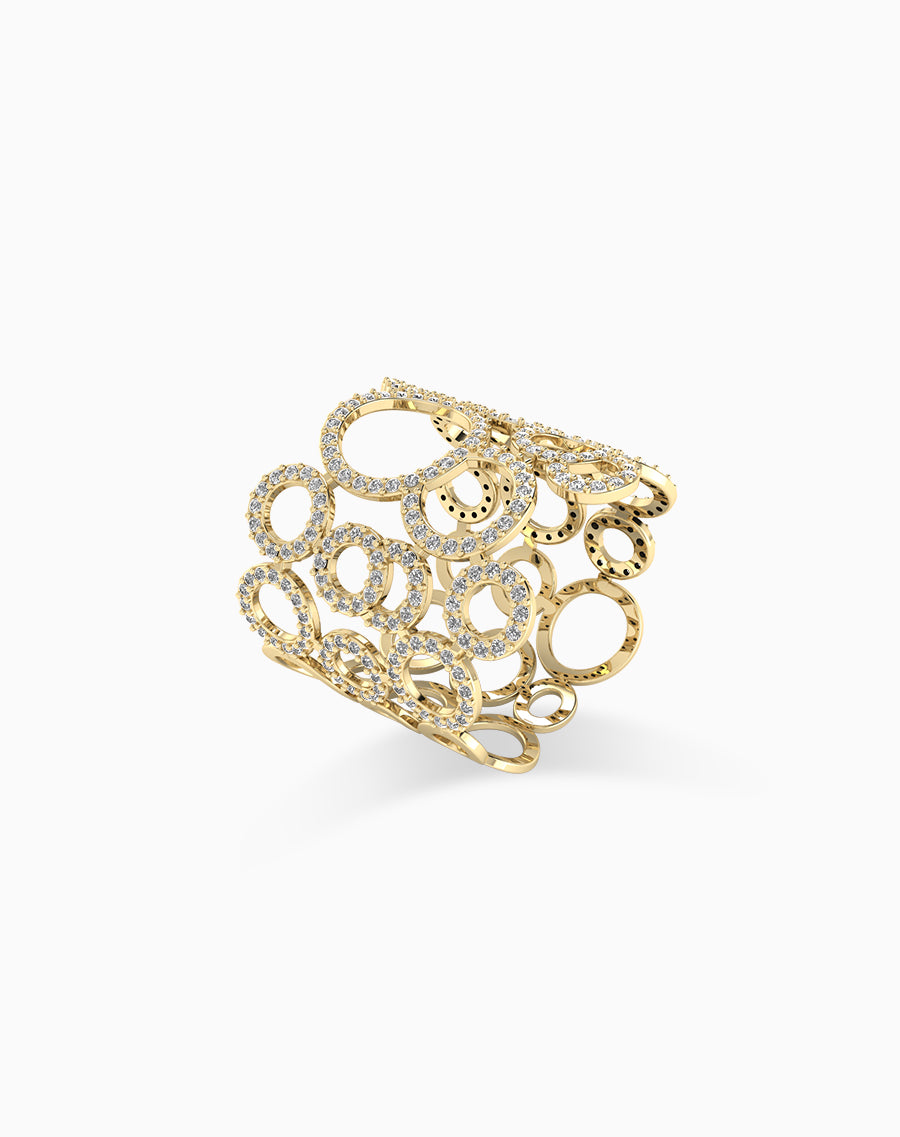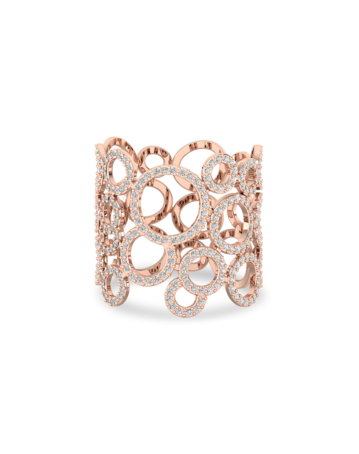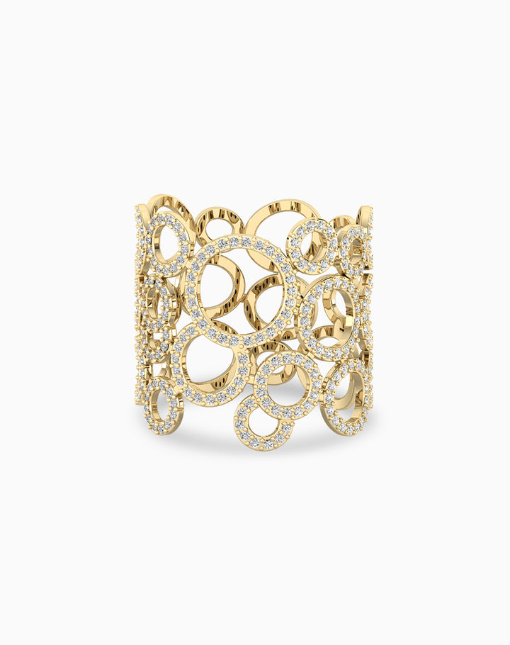 Adorned with pavé-set diamonds along one edge, each carefully chosen for brilliance and clarity, the ring catches the light with every movement, adding a dazzling sparkle that elevates any ensemble. The open design allows for a unique, airy feel, making it both striking and comfortable to wear.