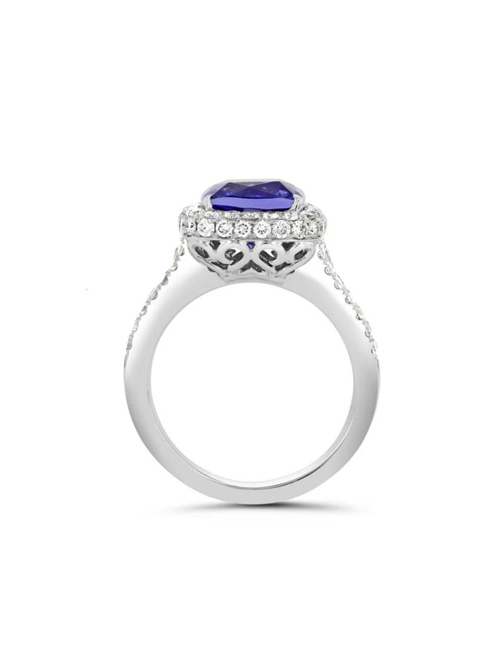 Surrounding the sapphire is a delicate halo of round brilliant diamonds, carefully selected for their exceptional G-H color and VS clarity. This sparkling frame intensifies the sapphire’s vivid color and adds an exquisite layer of radiant light, creating a mesmerizing contrast that draws the eye to the heart of the ring.