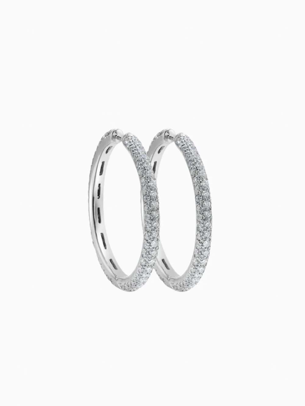 Bold in sparkle yet refined in design, the Diamond Hoops Earrings are a timeless emblem of sophistication and strength. Masterfully crafted in luminous 14k solid white gold, these hoops feature a seamless cascade of round brilliant-cut diamonds, each hand-set along the outer curve to maximize visibility and brilliance. Their classic profile is elevated by precise craftsmanship, turning a simple silhouette into a radiant, statement-worthy piece.