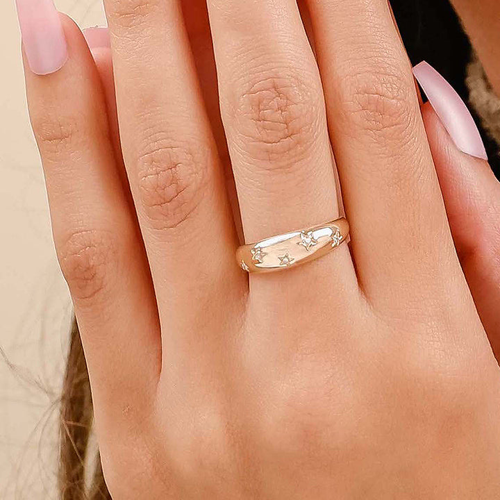 The surface of the dome is artfully adorned with pavé-set round brilliant diamonds, creating a breathtaking tapestry of light. Each diamond is meticulously placed to follow the natural curve of the gold, allowing the ring to shimmer with every movement. With exceptional G-H color and VS clarity, these stones emit a soft, continuous sparkle that wraps the finger in radiance without feeling heavy or ornate.