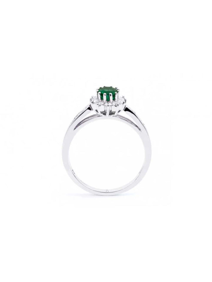 Set in polished 14k gold, the band features a sleek, tapered design that gracefully supports the centerpiece while offering a comfortable fit. The warm gold tones provide a luxurious contrast to the cool green of the emerald and the shimmering diamonds, creating a harmonious balance of color and light.