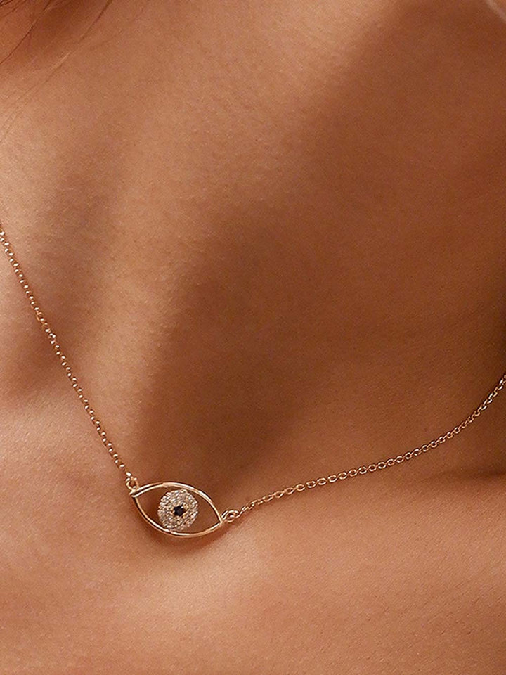 The symmetry of the evil eye motif, highlighted by the interplay between blue and white, creates a hypnotic and harmonious balance. Set against the cool luster of white gold, the gemstones shine with heightened contrast and sophistication. The pendant is suspended from a dainty, adjustable gold chain that rests elegantly at the collarbone, offering comfort for everyday wear or layering.