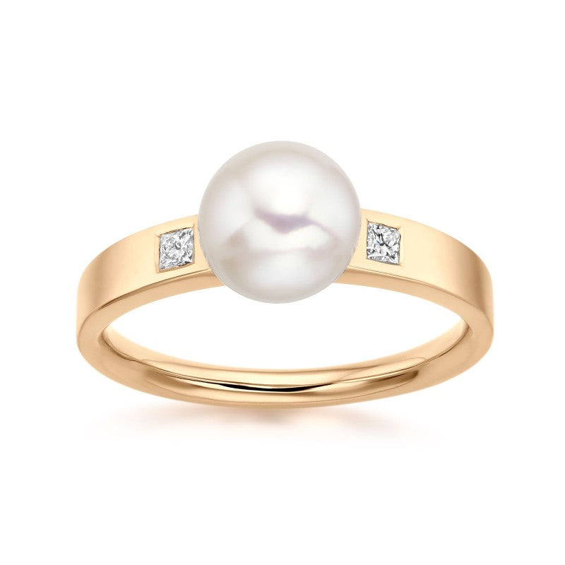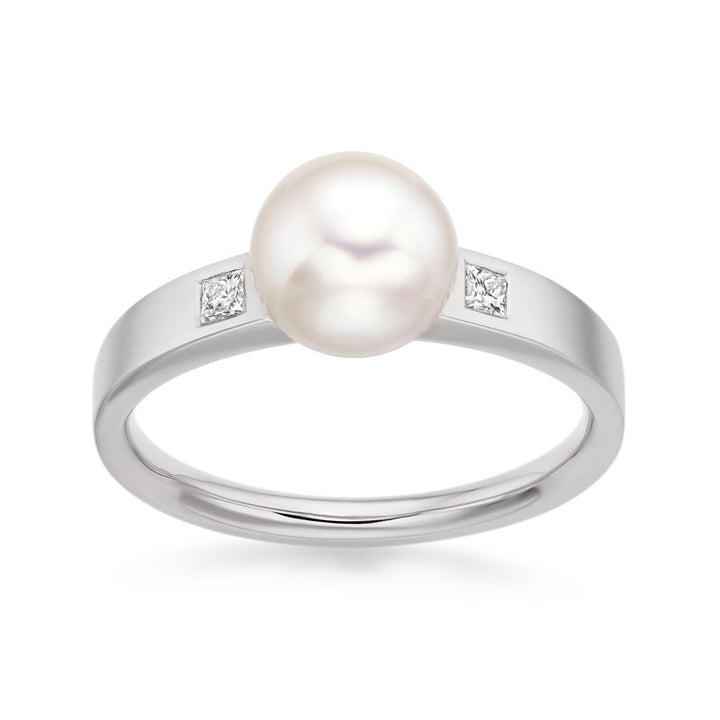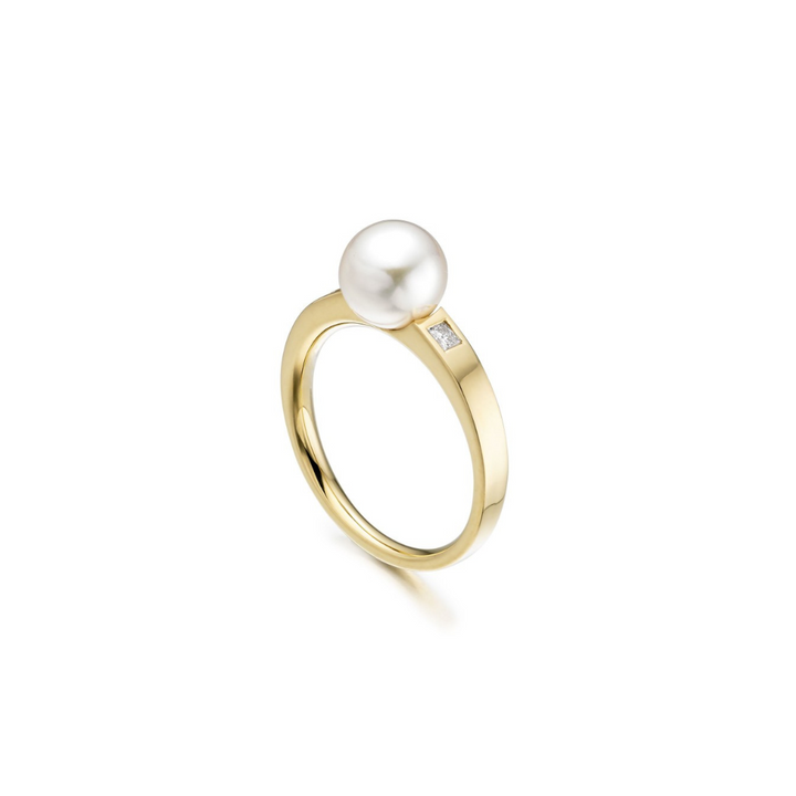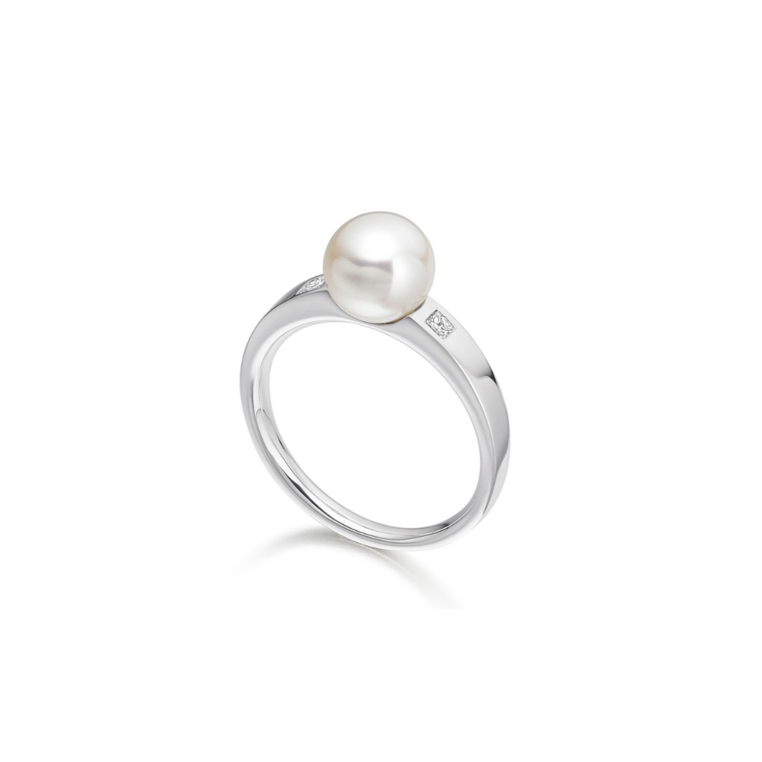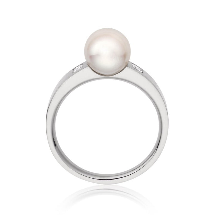 The Freshwater Pearl Ring with Two Side Diamonds in 14K white gold and yellow gold features a central lustrous freshwater pearl, complemented by two sparkling diamonds on each side. The design balances the natural beauty of the pearl with the brilliance of the diamonds, set against a sleek, polished white and yellow gold band. This ring exudes elegance, making it an ideal statement piece for both casual and formal occasions.