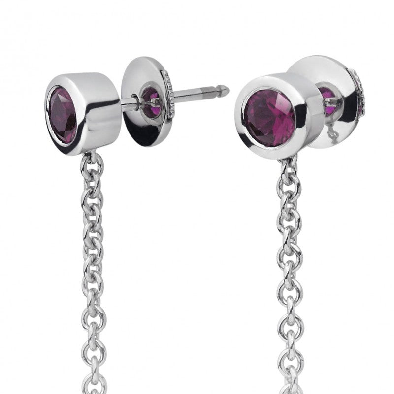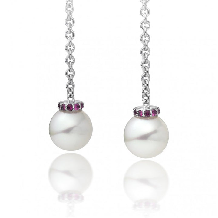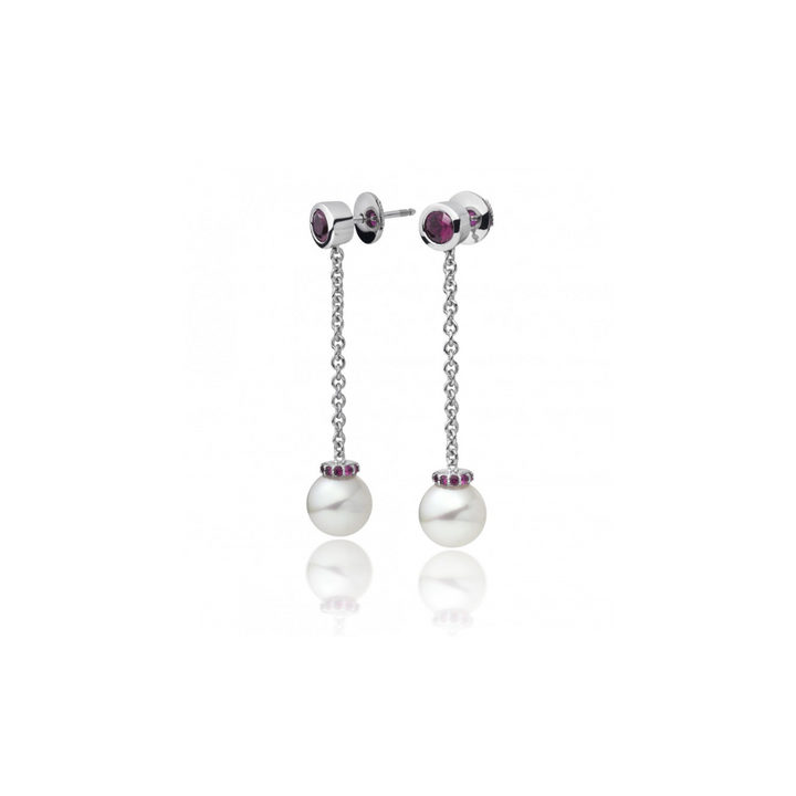 The Hanging Pearl Earring with ruby, crafted in 14K white gold, features a graceful freshwater pearl suspended from a vibrant ruby gemstone. This elegant design combines the lustrous pearl with the rich red hue of the ruby, creating a sophisticated and eye-catching look. The earring's luxurious combination is perfect for both everyday wear and special occasions.