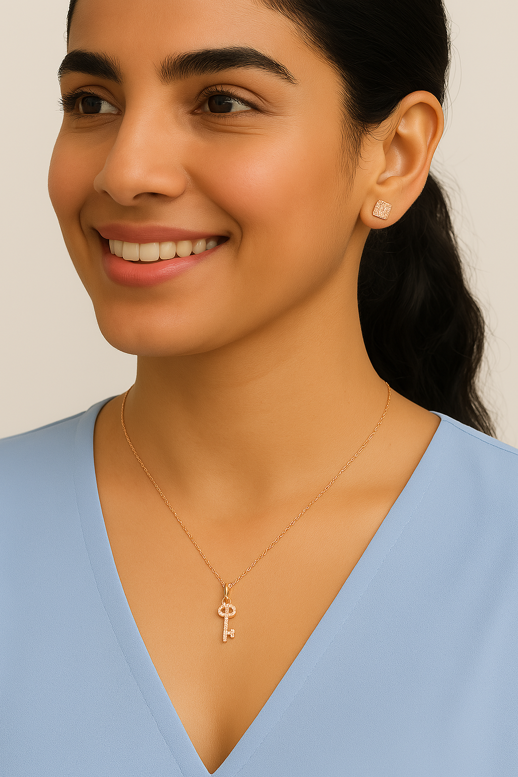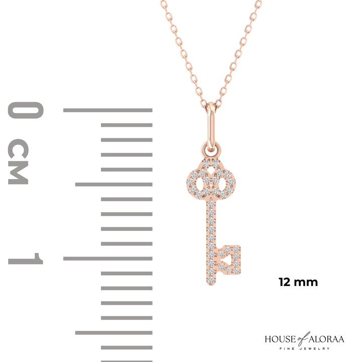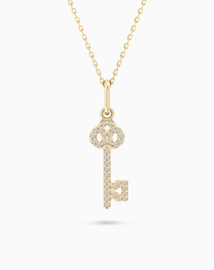 Unlock the door to love and cherished moments with this romantic pendant, a beautiful symbol of affection, trust, and deep connection. Crafted from radiant 14K gold, it features a delicate key design intricately adorned with brilliant, ethically sourced diamonds that sparkle with exceptional clarity and fire.