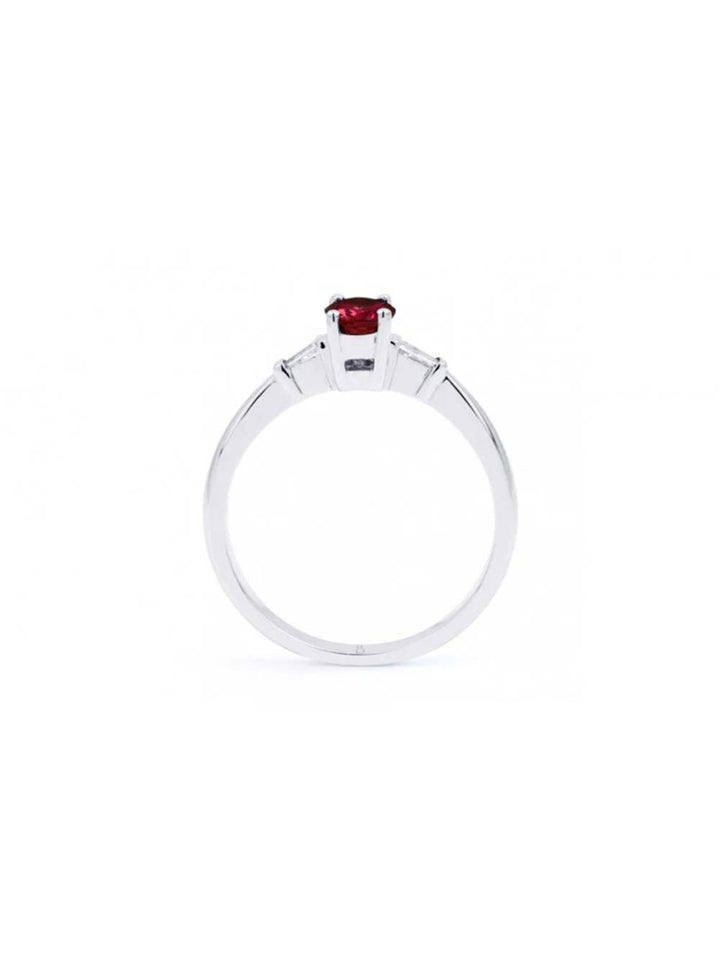 Flanking the ruby on either side are delicate pavé-set round brilliant diamonds—each selected for exceptional G-H color and VS clarity. These shimmering diamonds form a gentle arc that accentuates the ruby’s vibrant red, creating a luminous contrast that draws light inward and intensifies the centerpiece’s fiery glow. The pavé diamonds add just the right amount of sparkle without detracting from the ruby’s commanding presence.