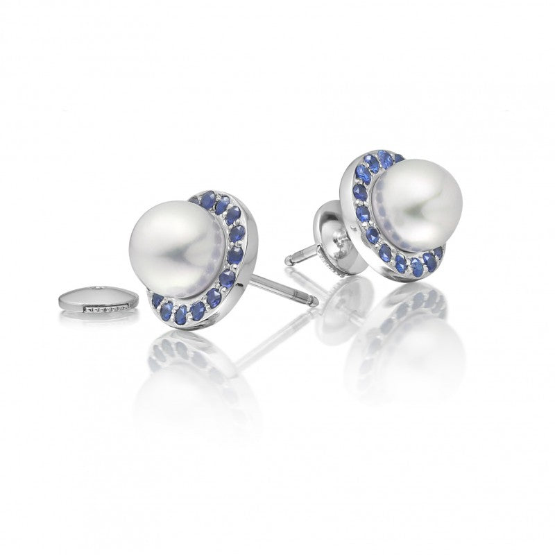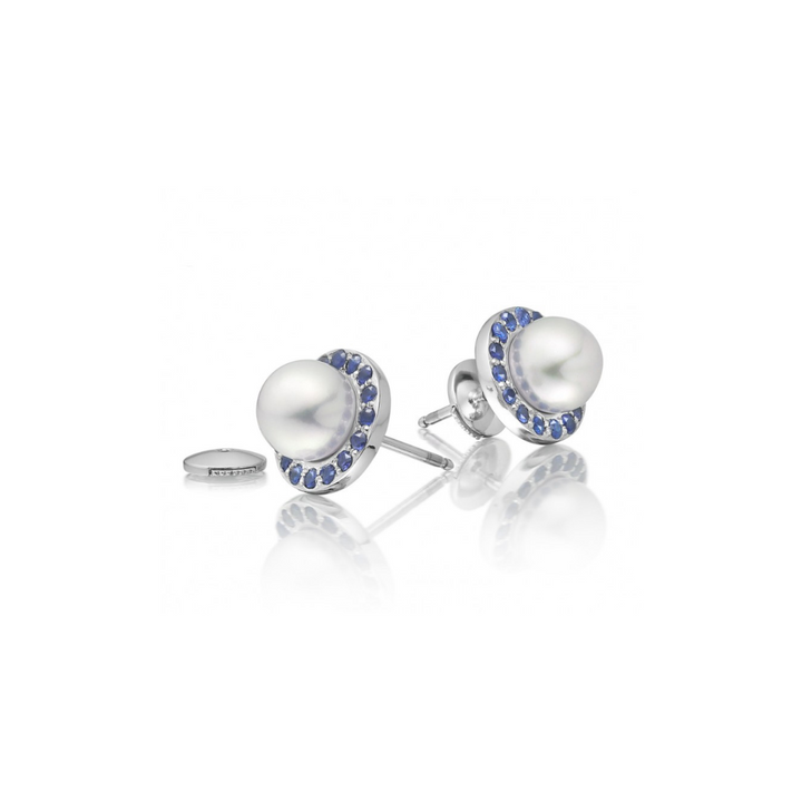 The Pearl Studs with Blue Sapphire, made in 14K white gold, combine the natural elegance of freshwater pearls with the vibrant contrast of blue sapphires. This luxurious design offers a sophisticated yet subtle statement, perfect for various occasions. The refined white gold setting enhances the beauty of both the pearl and sapphire, creating a timeless and elegant accessory.