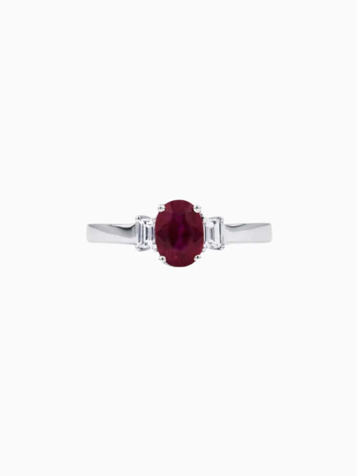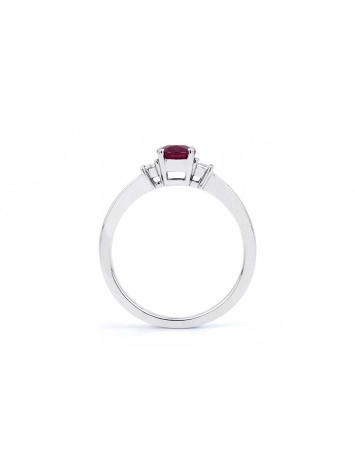 The white gold band is sculpted with graceful curves and a sleek, slender profile, tapering gently toward the centerpiece to draw the eye inward. Its high-polish finish offers a cool, luminous backdrop—amplifying the ruby’s warm tones and the crystals’ scintillation. Underneath the setting, delicate openwork allows light to pour through, maximizing the sparkle of both ruby and crystals.