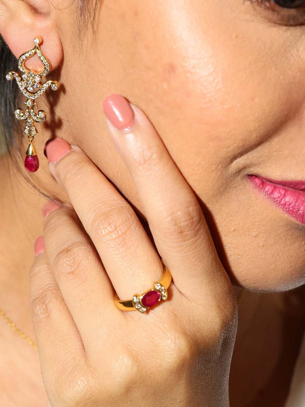 A radiant celebration of passion and prestige, the Crimson Glory Ruby & Diamond Ring captures timeless elegance in a refined 14K gold setting. At its heart lies a vivid, natural ruby—renowned for its deep crimson hue and symbolic power of love and vitality. Sourced from the storied mines of Mozambique, this ruby exhibits rich saturation and excellent clarity, making it a true heirloom-quality gem. Flanking the ruby are brilliant-cut natural diamonds, hand-selected for their G–H color and VS clarity. These luminous accents form a delicate halo and side detailing that magnifies the ruby’s fire while adding a graceful sparkle to every movement. The polished 14K gold band offers a sleek, enduring base that elevates the piece's regal aura. Its fine craftsmanship ensures a comfortable fit and a graceful silhouette, perfect for special occasions or as a meaningful everyday luxury. Whether chosen as a promise ring, anniversary gift, or personal indulgence, the Crimson Glory Ring embodies elegance, strength, and deep emotional resonance. A wearable treasure, designed to shine across generations.