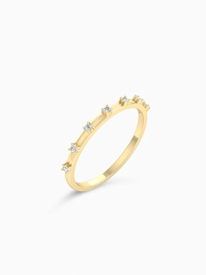 The thoughtfully sequenced placement of the diamonds creates a rhythmic cadence of sparkle, allowing each gem to stand out while contributing to a cohesive flow of light. This airy spacing lends the ring an open, organic feel—symbolizing the beauty of moments seamlessly connected yet individually radiant. The warm glow of the gold band provides a luminous backdrop, enhancing each diamond’s icy brilliance as it catches and refracts light with every movement.