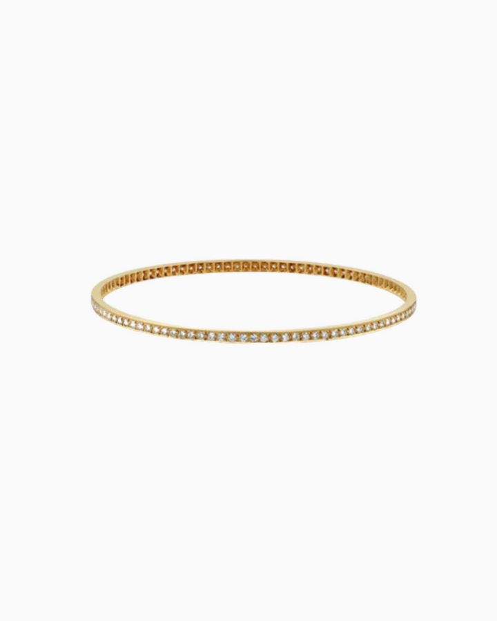 Timeless and refined, this diamond-studded bracelet exemplifies the purity and precision of classic diamond jewelry. Crafted in polished 18k white gold, the bracelet features a single line of round brilliant-cut diamonds, each stone carefully selected for its exceptional clarity, cut, and luminosity. These diamonds, sourced from trusted global suppliers, are prized for their lasting brilliance and symbolic strength—attributes that make them a perennial favorite in fine jewelry.