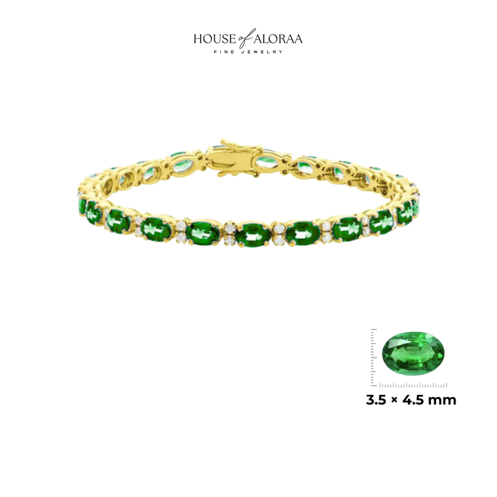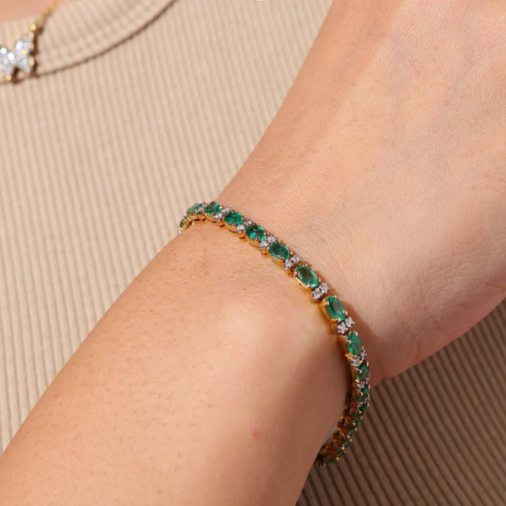 Striking in its simplicity, this single row emerald tennis bracelet is an elegant expression of refined taste. Crafted in 14k solid gold, the bracelet features a continuous line of Colombian emeralds interspersed with brilliant-cut diamonds, each hand-set to ensure balance, symmetry, and fluidity. Colombian emeralds are globally celebrated for their lush green tone, naturally high transparency, and rarity. Their color is so unique and vibrant that it has become the global standard for emerald quality.