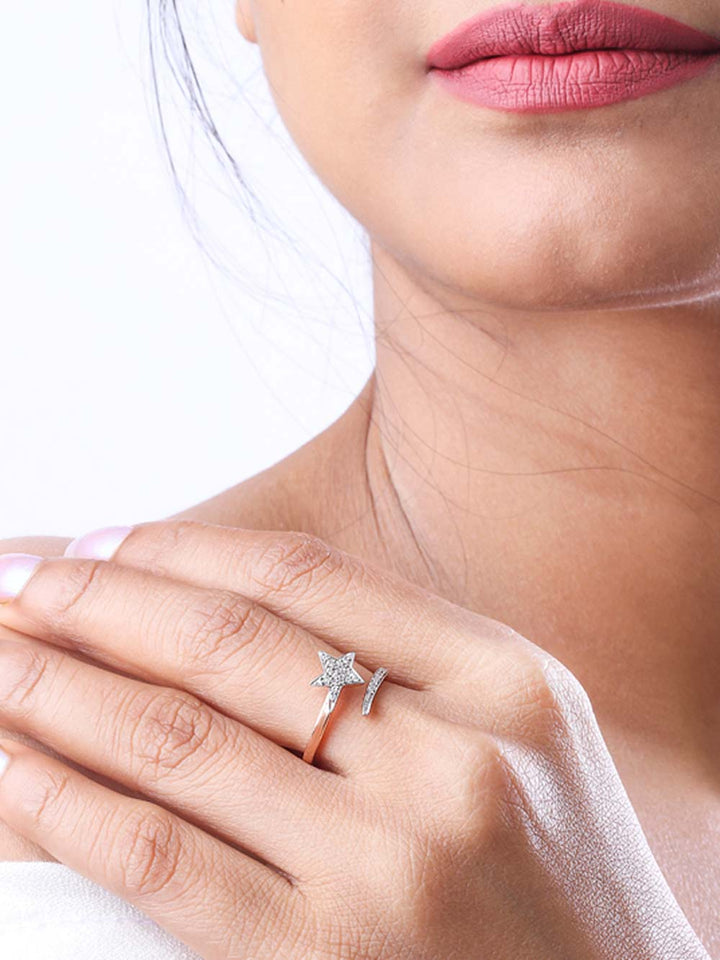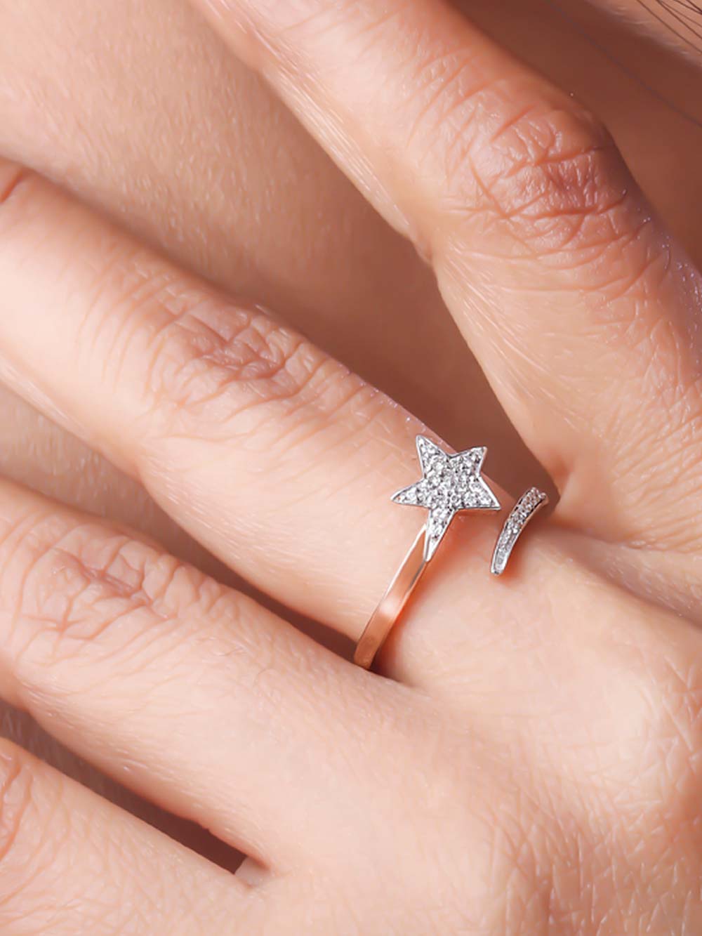 The warm gold band, polished to a flawless mirror finish, tapers gently toward the back for a comfortable fit. Its smooth interior ensures effortless wear, while the ring’s open silhouette imparts an airy, ethereal quality that feels weightless on the hand. The interplay of gold and diamond embodies the dance of shadow and light, capturing the moon’s timeless allure.