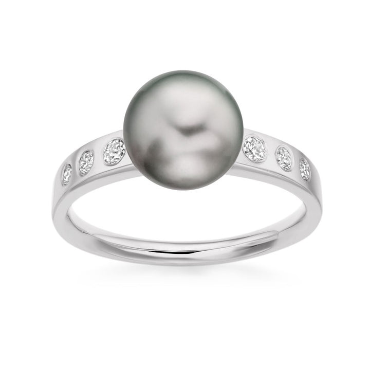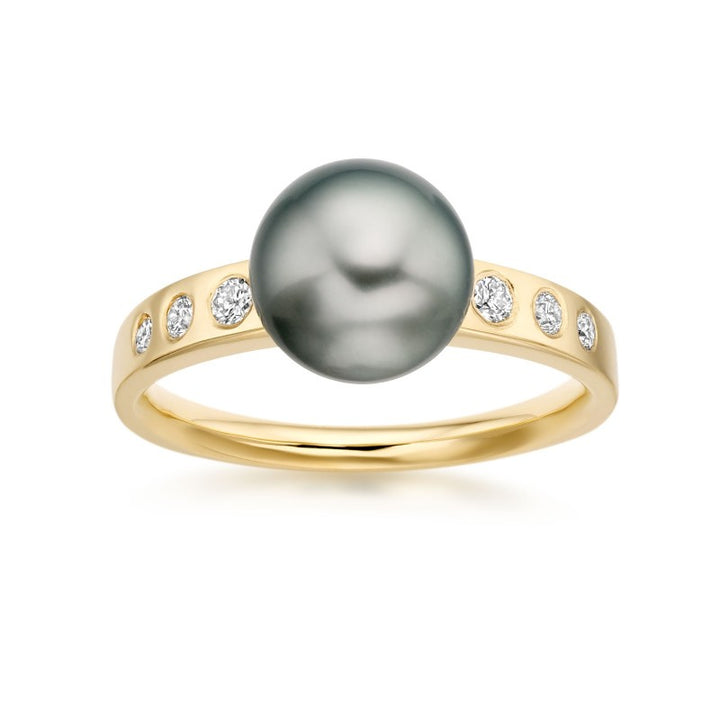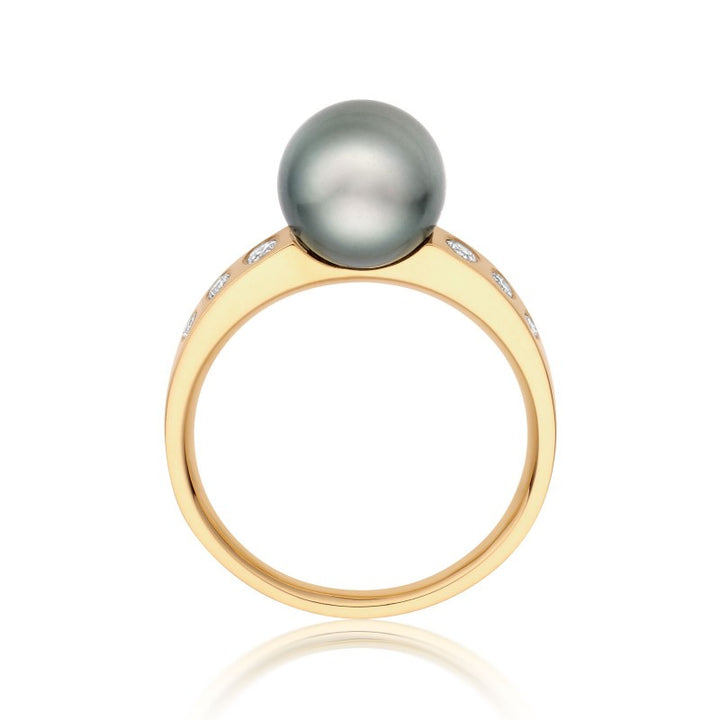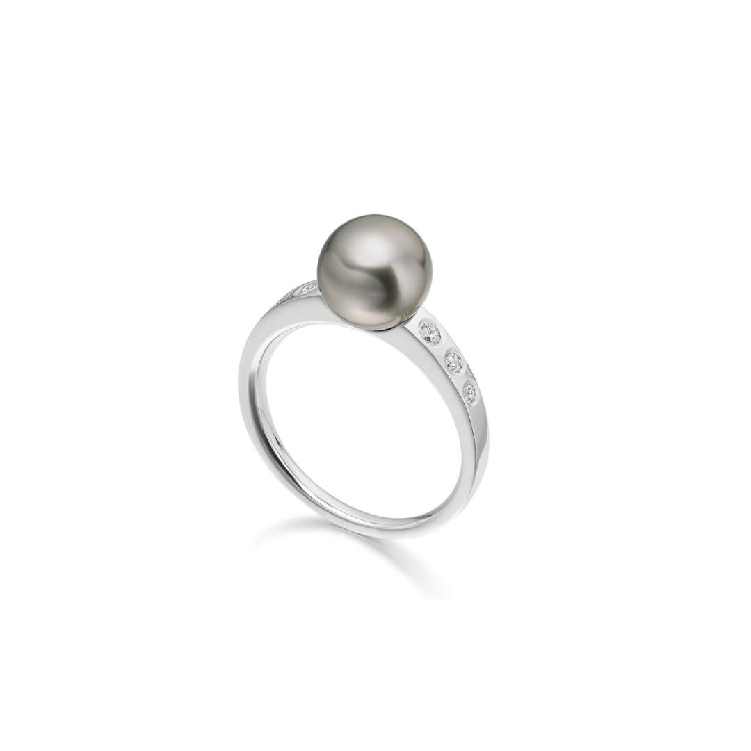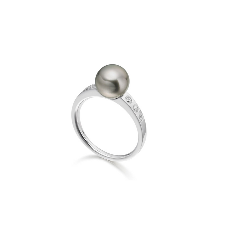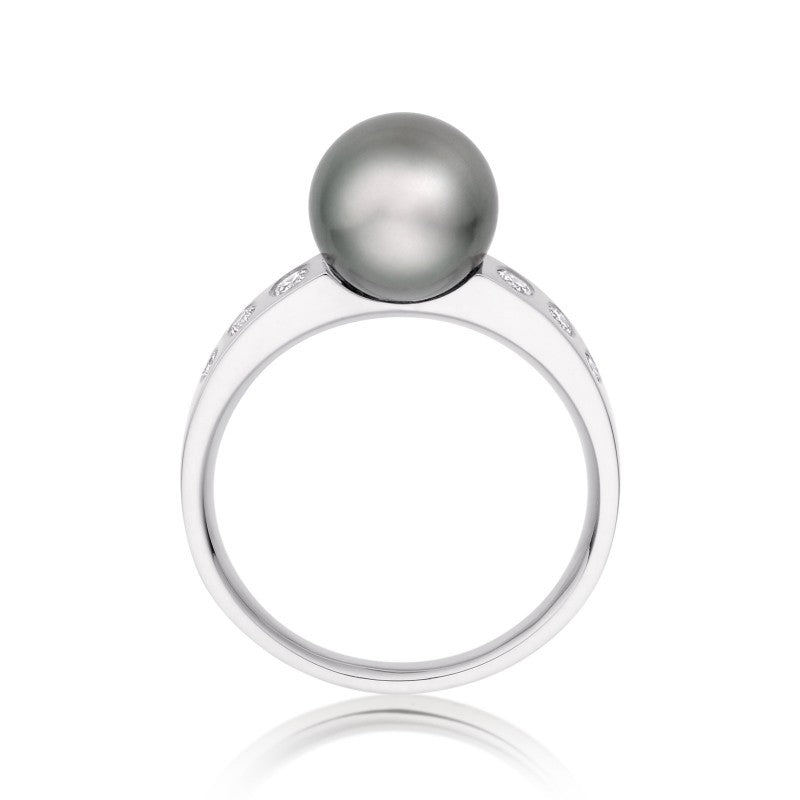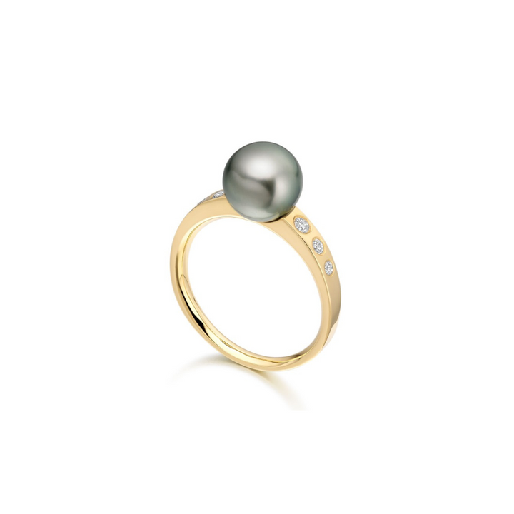 The Tahitian Pearl Ring with Two Side Diamonds set in 14K white gold and yellow gold features a captivating Tahitian pearl at its center, surrounded by two exquisite diamonds on either side. This design offers a perfect balance of elegance and sophistication, with the dark luster of the pearl beautifully contrasting the sparkle of the diamonds. A stunning piece, ideal for those seeking a luxurious yet timeless accessory.